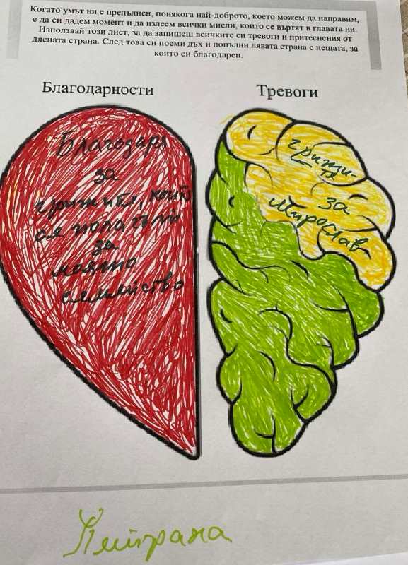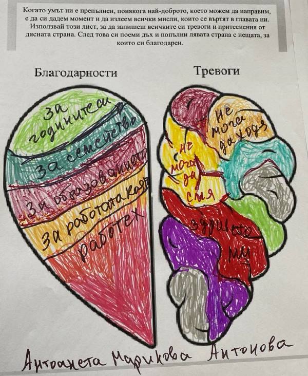 - От дясната страна, във формата на мозък, започни да записваш всичко, което те тревожи или уморява в момента – няма нужда да има подредба. Просто „изсипи“ мислите си.