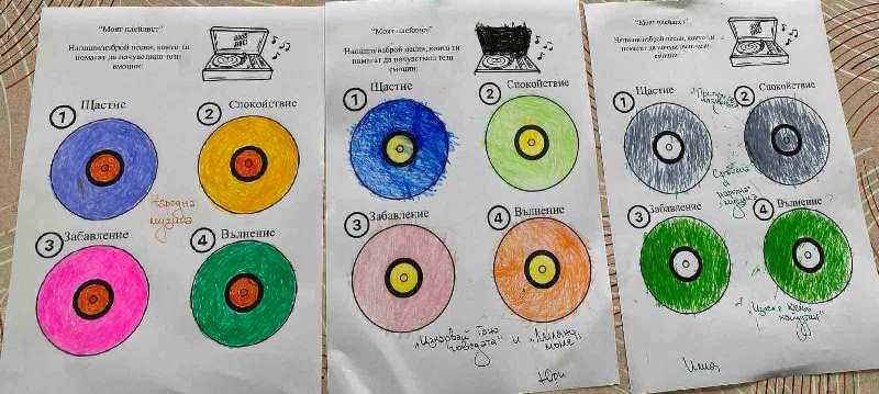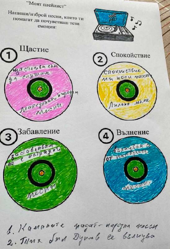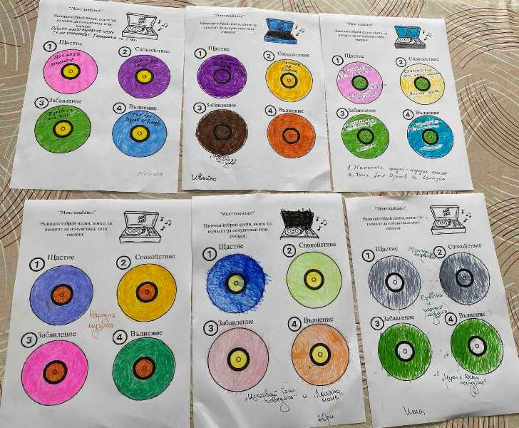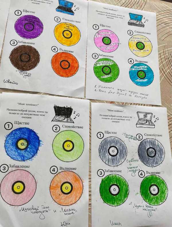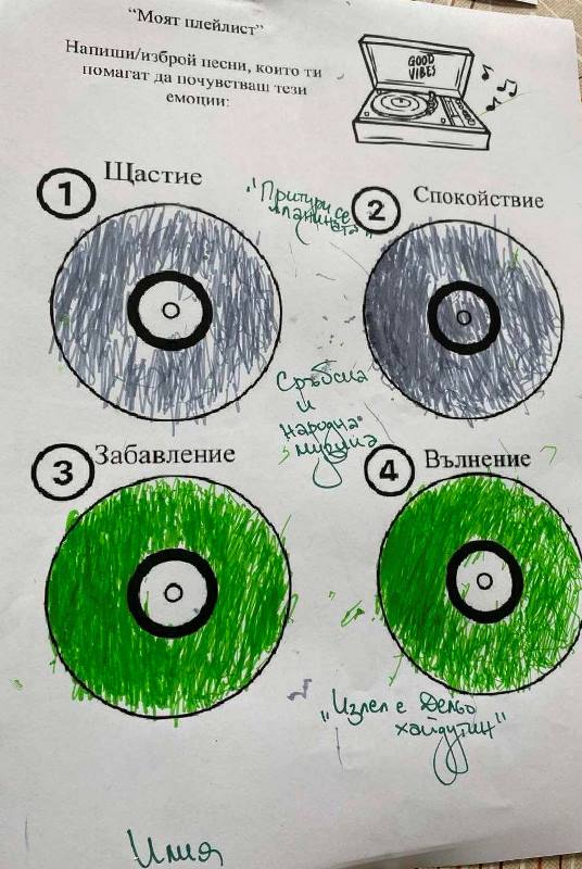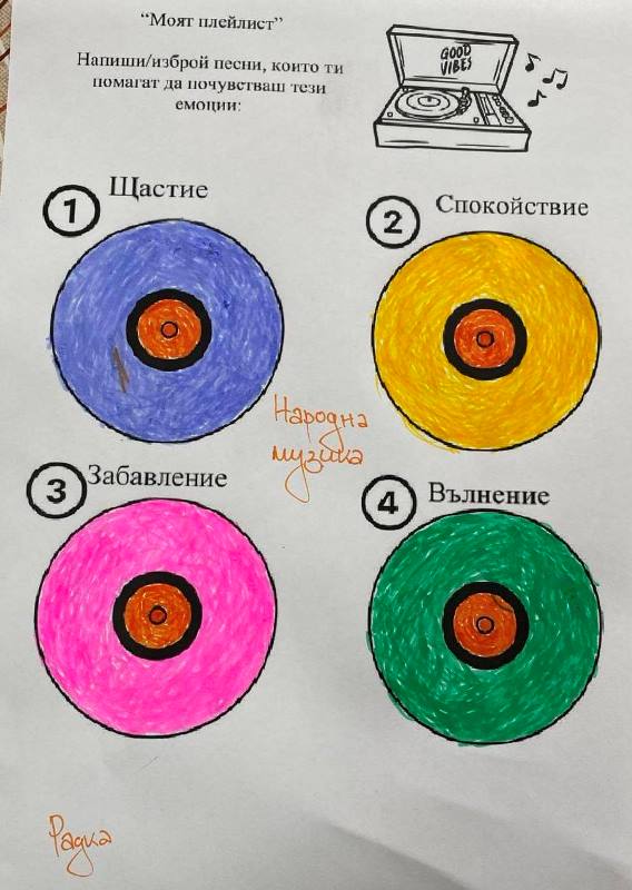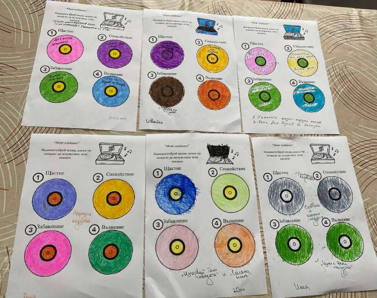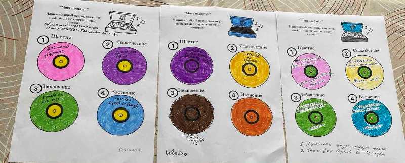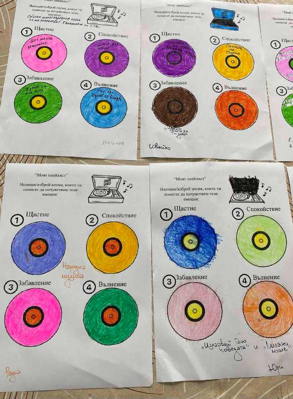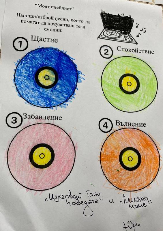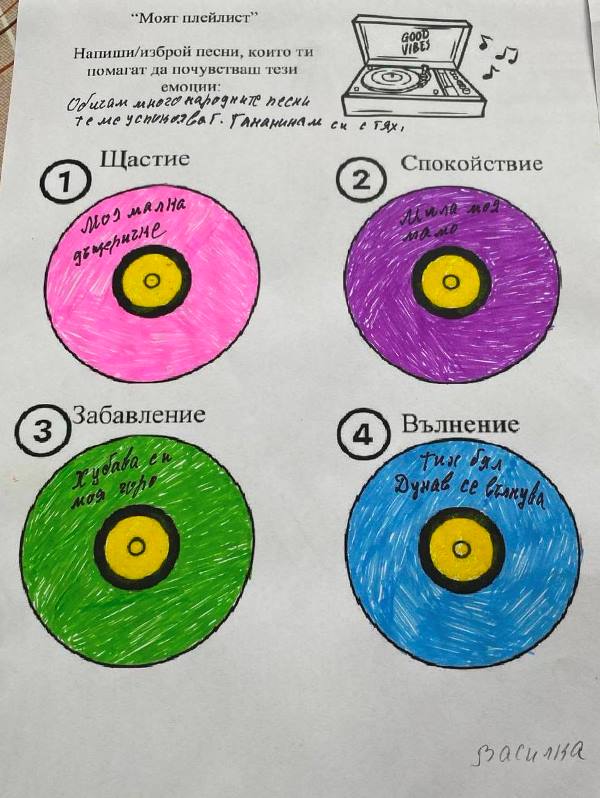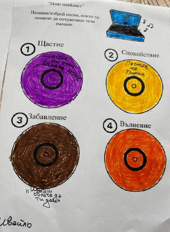 “Във всеки от кръговете (плочи) напиши песен (или вид музика), която ти помага да почувстваш съответната емоция – щастие, спокойствие, забавление или вълнение. Можеш и да нарисуваш картина или символ, който ти напомня за тази емоция и музиката, която я предизвиква!” - това бе заданието за проведената арт - терапия през първата деседневка на октомври 2025 година.