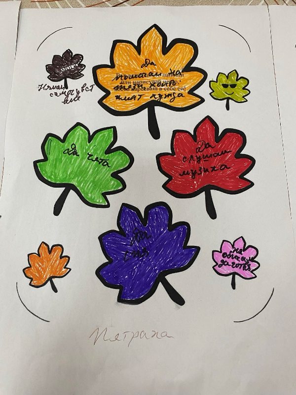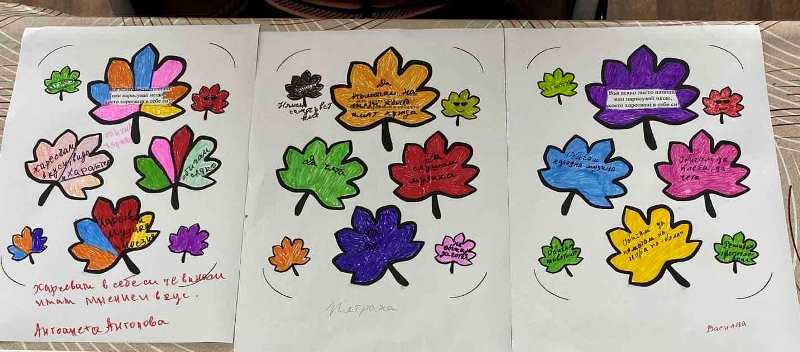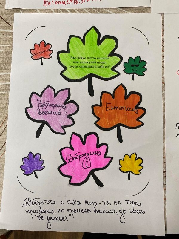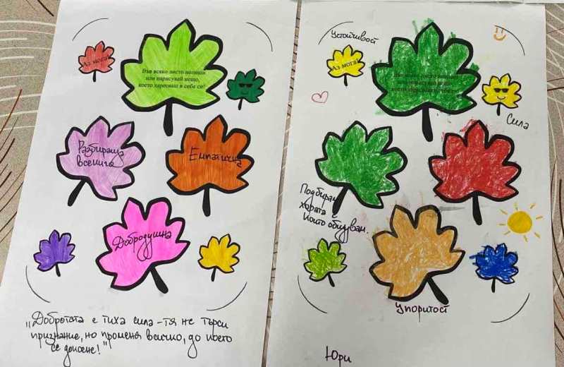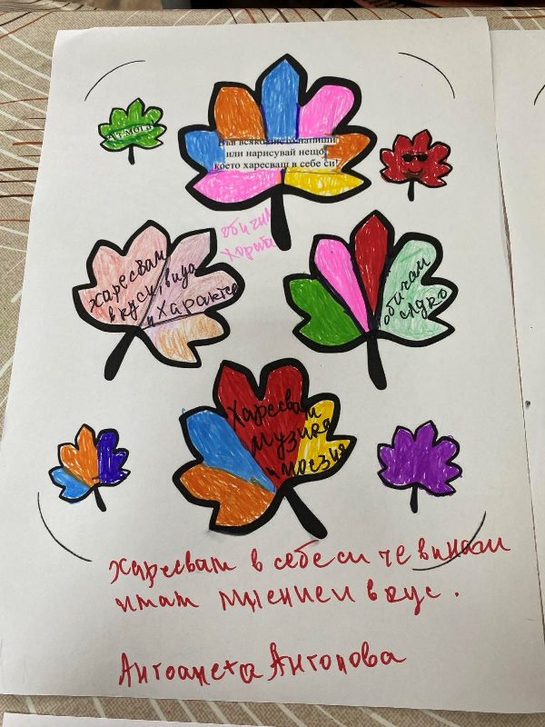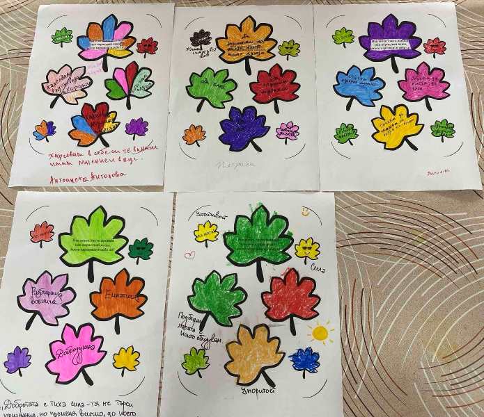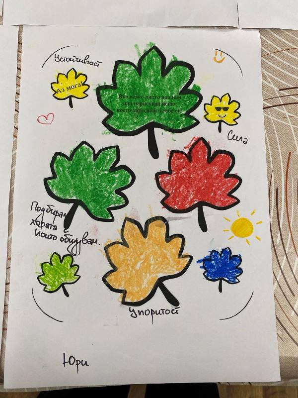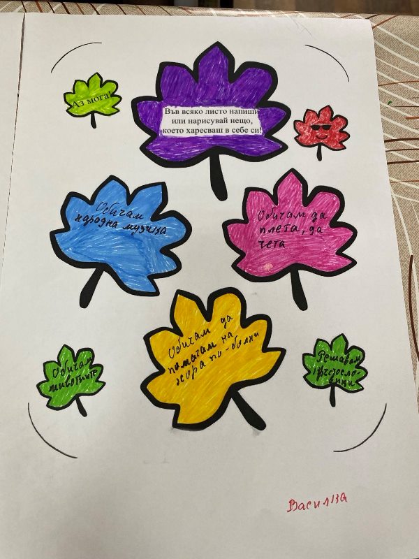 б/ Напиши или изобрази по едно такова качество във всяко листо. Може да използваш думи, символи, цветове – важно е да ги направиш свои.