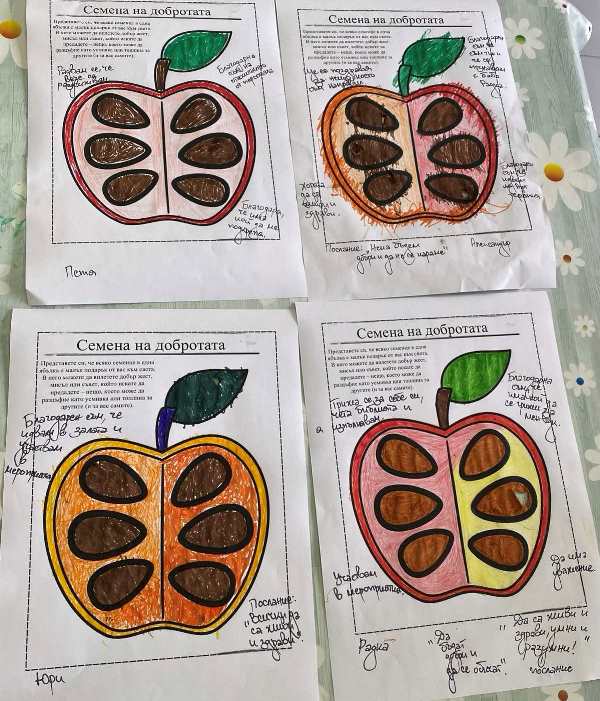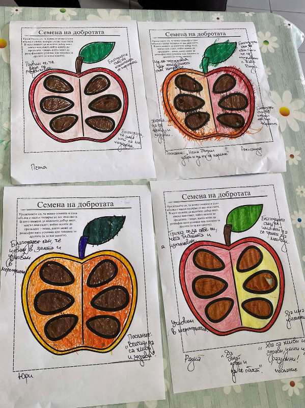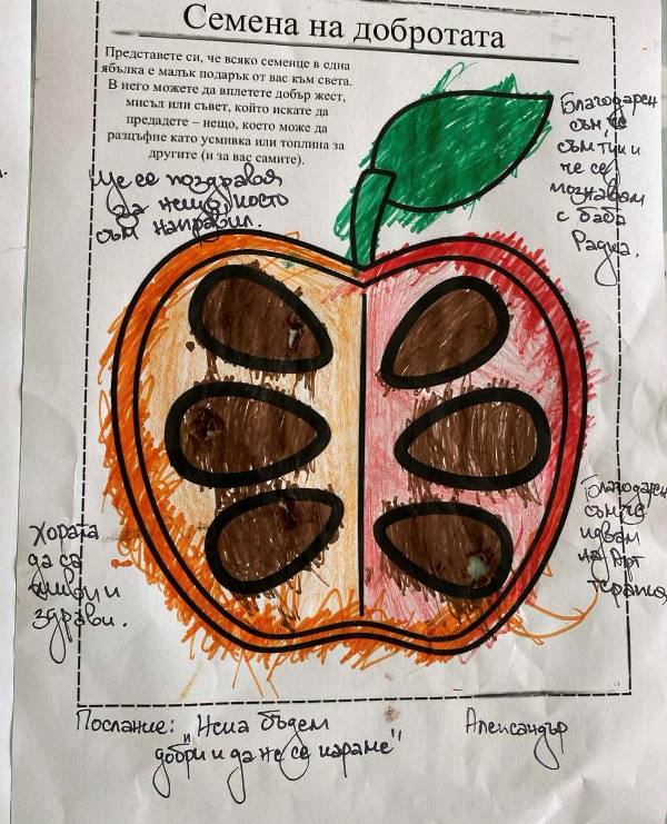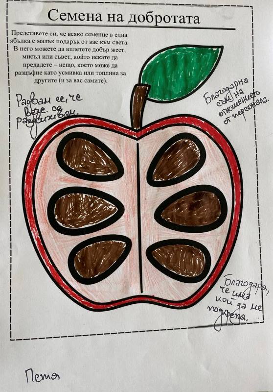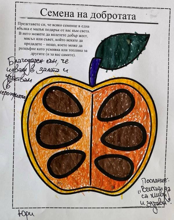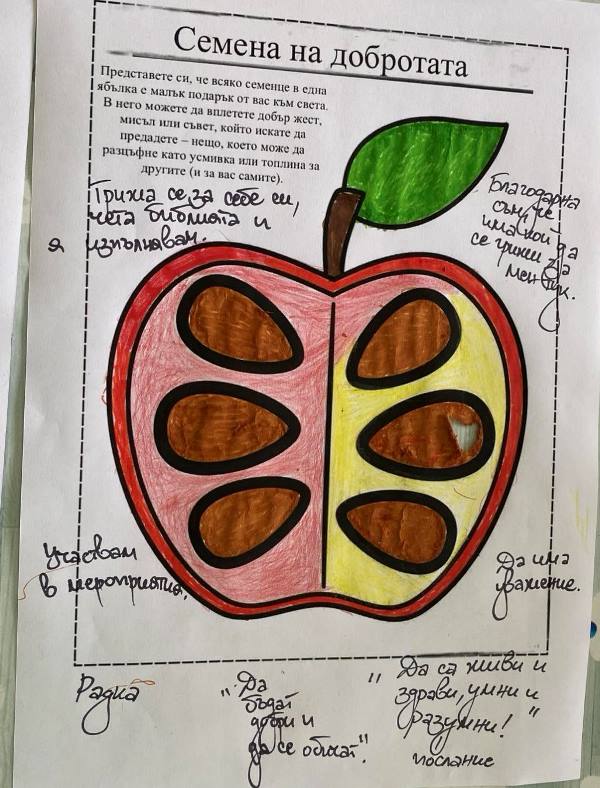 3. Посадете семената: Оцветете ябълката и изберете едно или две семена, за да осъществите добрия жест днес – така семенцата на добротата ще разцъфнат в реални действия!