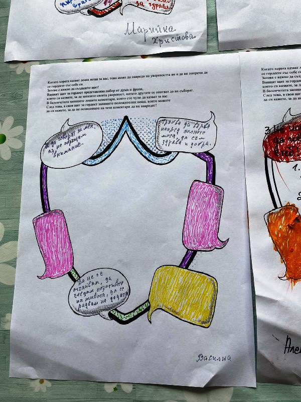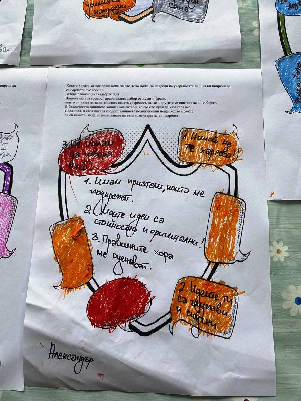 В балончетата запишете лошите коментари, които сте чули да казват за вас. След това, в своя щит за гордост запишете положителни неща, които можете да си кажете, за да не позволявате на тези коментари да ви навредят!” - това бе задача за потребителите, участващи в поредната арт терапия - втора половина на месец август 2024 година .
